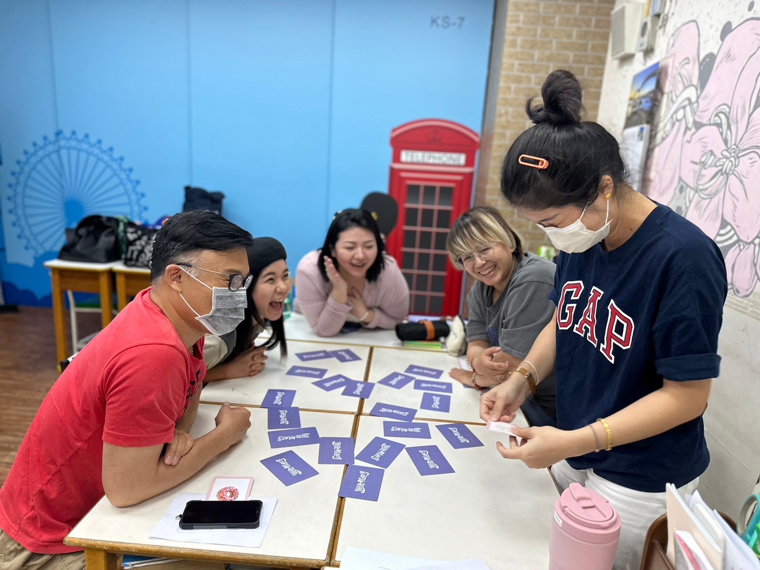 初階遊戲和進行方式熟悉後,麗芳老師再帶我們轉換玩法,特別介紹猜圖卡主題搶答,先將全部圖卡散放置中,每人抽張卡再輪流形容描述讓組員猜中心主題,訓練表述能力,也是逆推思考的一環,多元運用圖卡、創造更多可能,開啟思考活口。